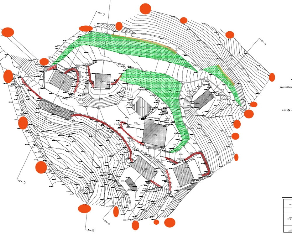 Foto's en tekeningen van het terrein van de B Bala, grenspaaltjes zoals gezet in 2009 (inmiddels allemaal 'verdwenen")